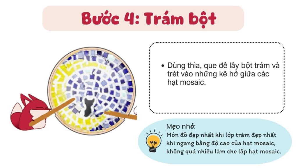 BƯỚC 4 – Trám bột: Mục đích của việc trám bột là lấp đầy những khoảng hở giữa các hạt mosaic. Vì thế, bạn hãy dùng thìa, que để lấy bột trám và trét vào những kẽ hở giữa các hạt mosaic. Món đồ đẹp nhất khi lớp trám đẹp nhất khi ngang bằng độ cao của hạt mosaic, không quá nhiều làm che lấp hạt mosaic.