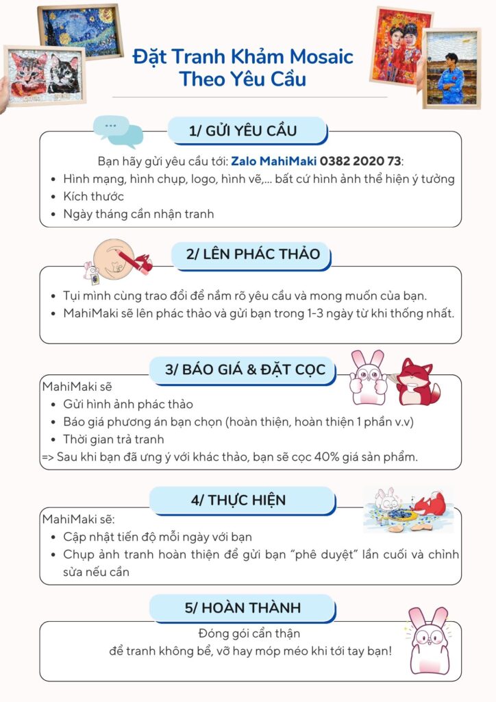 Tấm hình đẹp đẽ của một người, một khung cảnh đầy kỷ niệm, một chiếc logo nhân lễ kỷ niệm,… dù là ý tưởng, hình chụp, hay hình vẽ,…MahiMaki sẽ lắng nghe và đưa ra bản thiết kế để đưa hình ảnh bạn mong muốn vào bức tranh mosaic. MahiMaki hiểu rằng mỗi món quà đều mang một thông điệp dành riêng cho người tặng nên chúng mình sẽ luôn nỗ lực thể hiện thông điệp ấy.